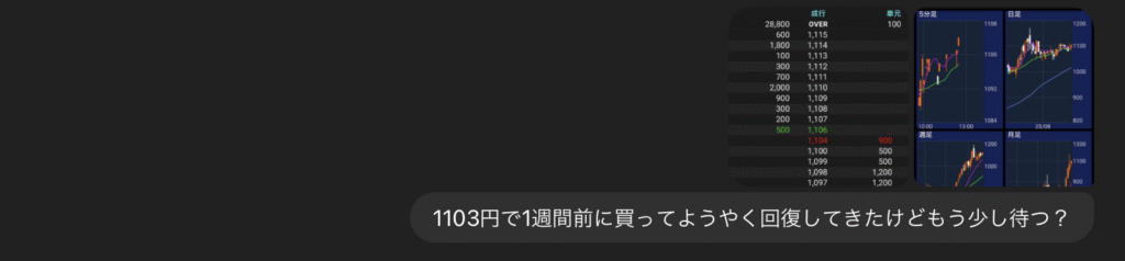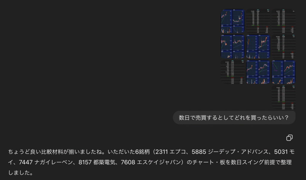 ChatGPTのDeepResearchを活用して銘柄候補を出し、さらに自分でスクショしたチャート・板情報をもとに買い時を相談するという流れです。